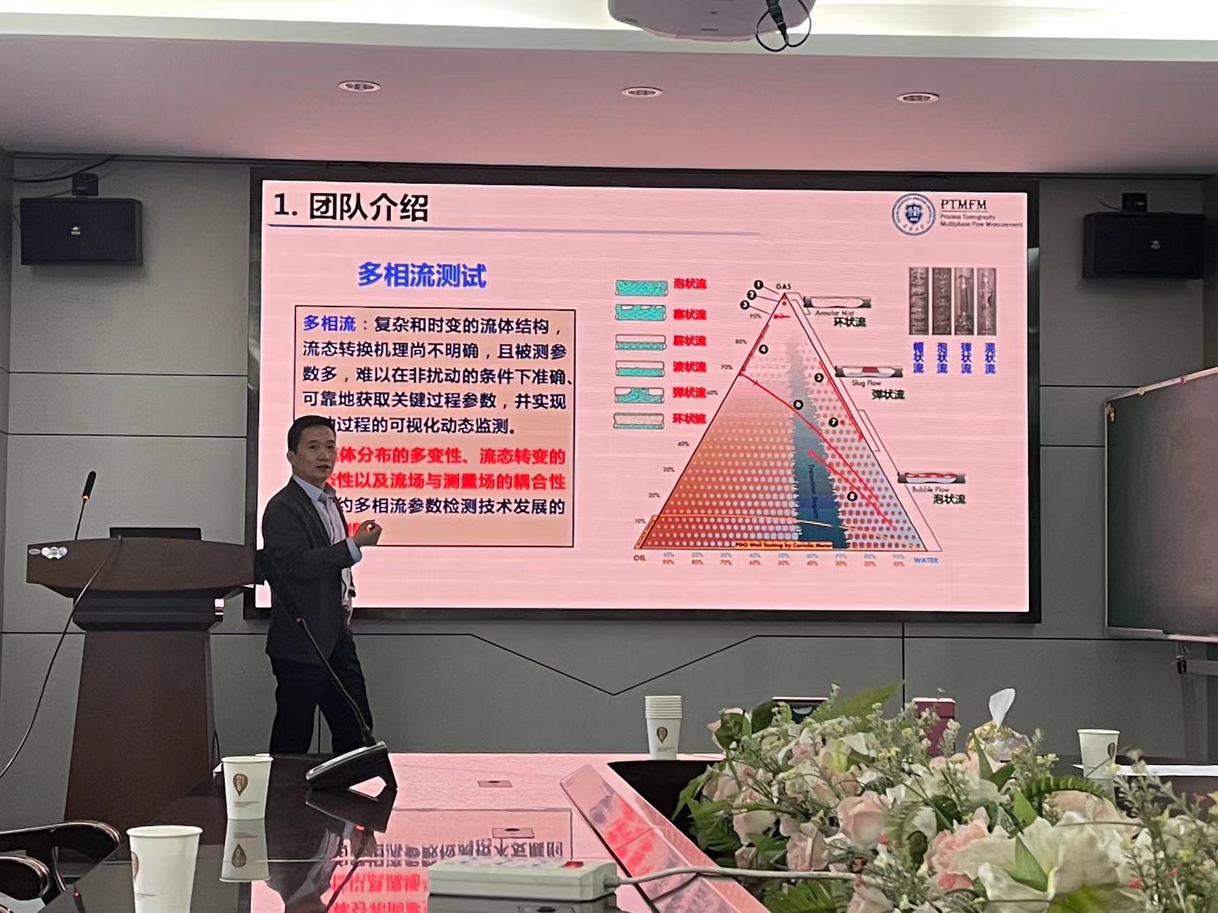 多种流体的混合流动(简称多相流)广泛存在于自然界与工业生产中,多相流是工业生产与科学研究中,对其过程参数的无扰动在线准确检测与状态辨识一直是工业与科研领域亟待解决的检测难题。在报告中,谭超院长首先介绍了天津大学电气自动化与信息工程学院的发展历史,并介绍了所在团队的研究方向与现状。随后,针对管道中多相流体的流动状态难以测量的难题,介绍了基于同相介质电阻差异的电学感知方法、基于同相介质中声波传播速度差异的超声波感知方式等多种传感模态,并深入浅出的讲解了层析成像的基本原理与系统。紧接着,谭院长介绍了以电学、超声波感知为基础的多种过程参数实时在线测量方法。最后,谭院长总结了自己课题组在该领域的最新研究进展,以及研发技术与仪器的应用案例,并在报告结束后与会师生进行了热烈交流。