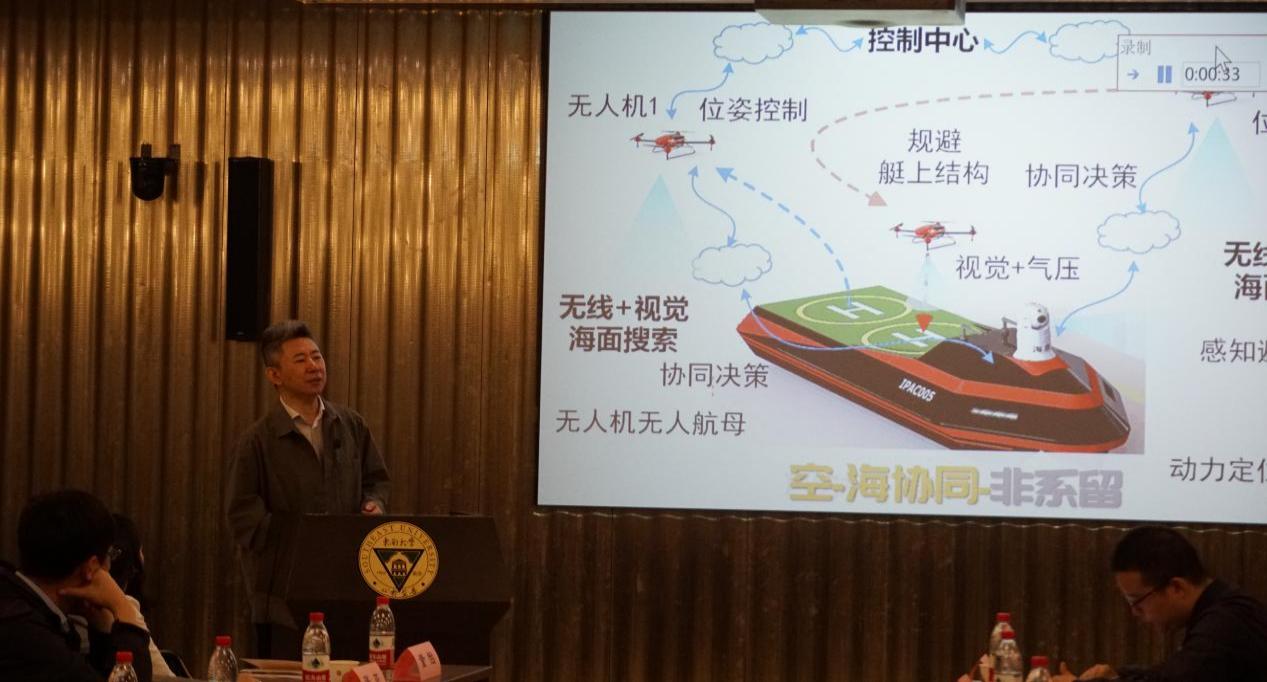 在上午的第二场报告中,上海交通大学张卫东教授作了题为“无人机控制:从单机到集群协同”的报告。报告首先围绕无人机的单机控制,介绍了该领域的研究思路,并展示了团队在无人机本体和组件开发、抗干扰控制、避障穿越树林、吊载减摇控制等方面的研究成果;其次,在集群协同部分,分析了集群编队控制所面临的挑战,介绍了研究思路,并展示了在集群编队、队形变换和协同吊载等方面的实验结果;最后,张教授介绍了空海跨域协同的关键技术,并展示了团队在相关工程开发和技术验证方面所取得的成果。