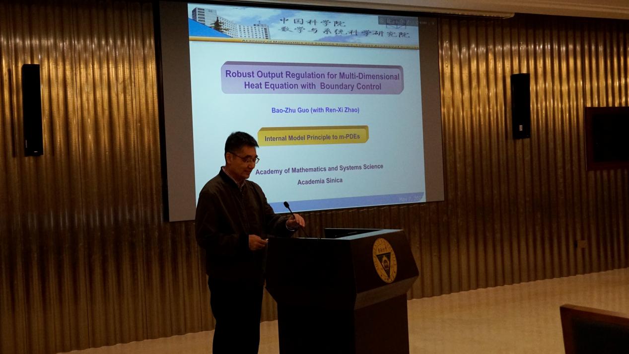 在下午的第四场报告中,中国科学院数学与系统科学研究院郭宝珠教授作了题为“高维热方程边界控制的鲁棒输出调节”的报告。报告介绍了团队近年来所提出的基于观测器的控制方法,成功地解决了一系列一维偏微分系统的输出调节问题,并讨论了针对高维偏微分方程的应用问题。这些内容增进了与会专家学者对偏微分系统输出调节的认知以及对观测器本质的理解,引发了在场热烈的讨论。