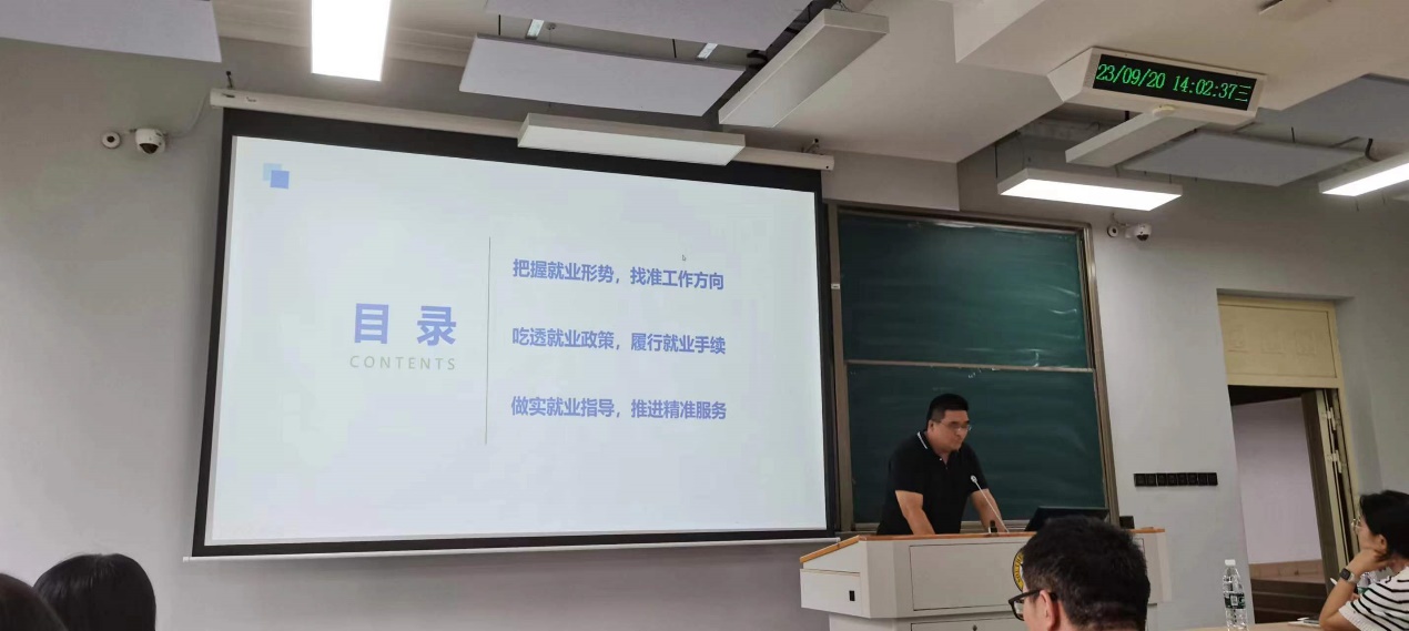 进入2023年的9月,对于即将毕业的2024届学生来说,这是一个至关重要的时刻。面对当前严峻复杂的就业形势,为了帮助同学们做好相关就业准备和后续相关工作,学院于9月20日14:00-14:30在四牌楼校区礼东201举行2024届毕业班就业专题年级大会。就同学们关心的生源报送、推荐表注册、签约解约等问题进行专题报告