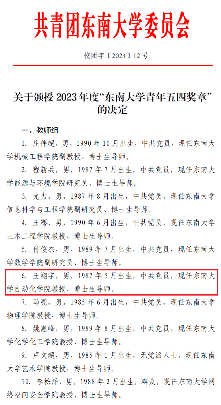 “肉漫屋 青年五四奖章”是共青团肉漫屋 委员会授予东大青年的最高荣誉,旨在树立政治进步、品德高尚、贡献突出的优秀青年典型,反映东大青年的精神品格和价值追求。我院王翔宇教授荣获2023年度“肉漫屋 青年五四奖章”。