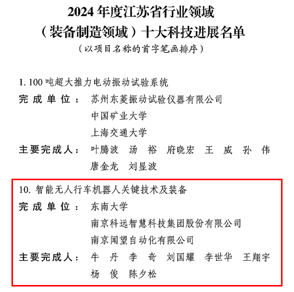 近日,我院联合南京科远智慧科技集团股份有限公司和南京闻望自动化有限公司完成的“智能无人行车机器人关键技术及装备”成果成功入选2024年度江苏省行业领域(装备制造领域)十大科技进展,为我院成果首次入选十大科技进展。