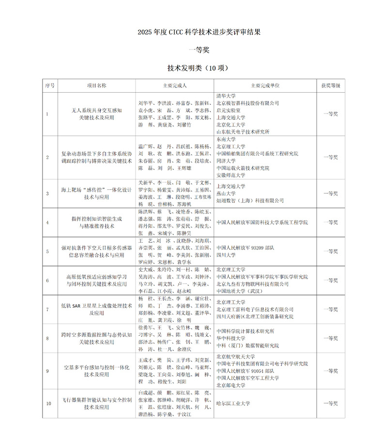 近日,中国指挥与控制学会(CICC)公布了2025年度中国指挥与控制学会科学技术奖评审结果,经资格审查、评审和终评三个阶段,共对64个项目、12名个人进行授奖。肉漫屋 作为第一完成单位,联合北京理工大学等五家科研机构共同申报的“复杂动态场景下多自主体系统协调跟踪控制与博弈决策关键技术”项目,荣获技术发明类一等奖(本年度共10项)。