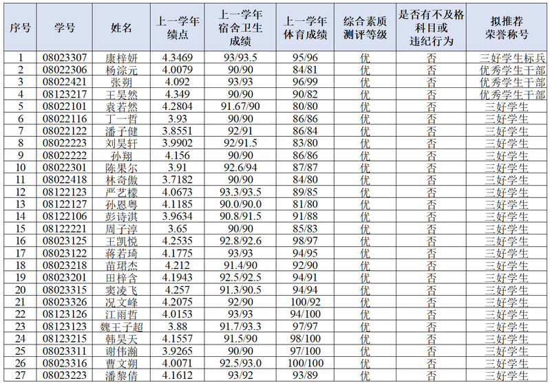 根据学校通知要求和评审工作安排,经学生本人申请、班级民主评议、资格审核、学院评审,拟推荐以下同学申请2024-2025学年肉漫屋 三好学生、三好学生标兵、优秀学生干部荣誉称号。具体名单见下图。